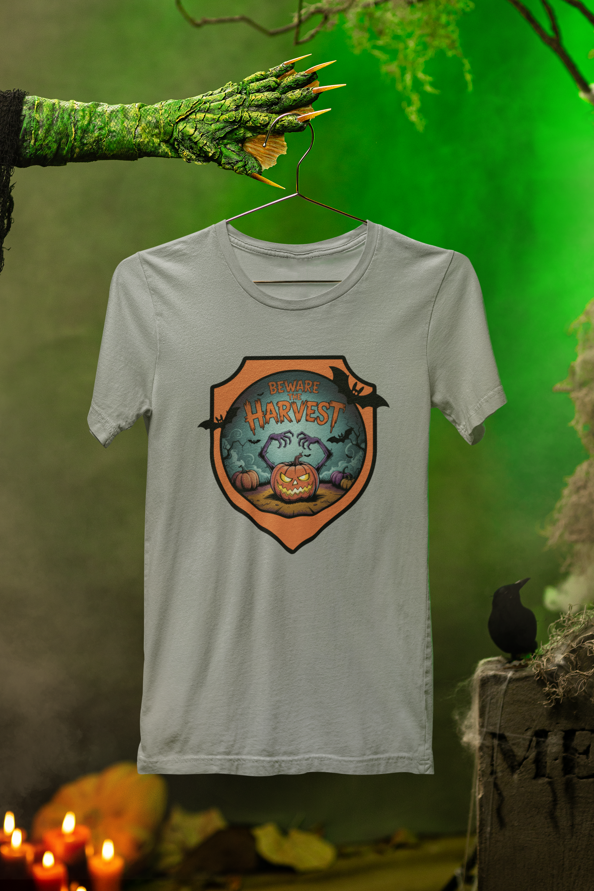 Dare to haunt the pumpkin patch in the Beware the Harvest Tee! With a glowing, grinning jack-o’-lantern that’s more trick than treat, this shirt brings the perfect mix of eerie and playful to your Halloween adventures. Ideal for ghost walks, graveyard crawls, or just showing off your spooky side all season long.