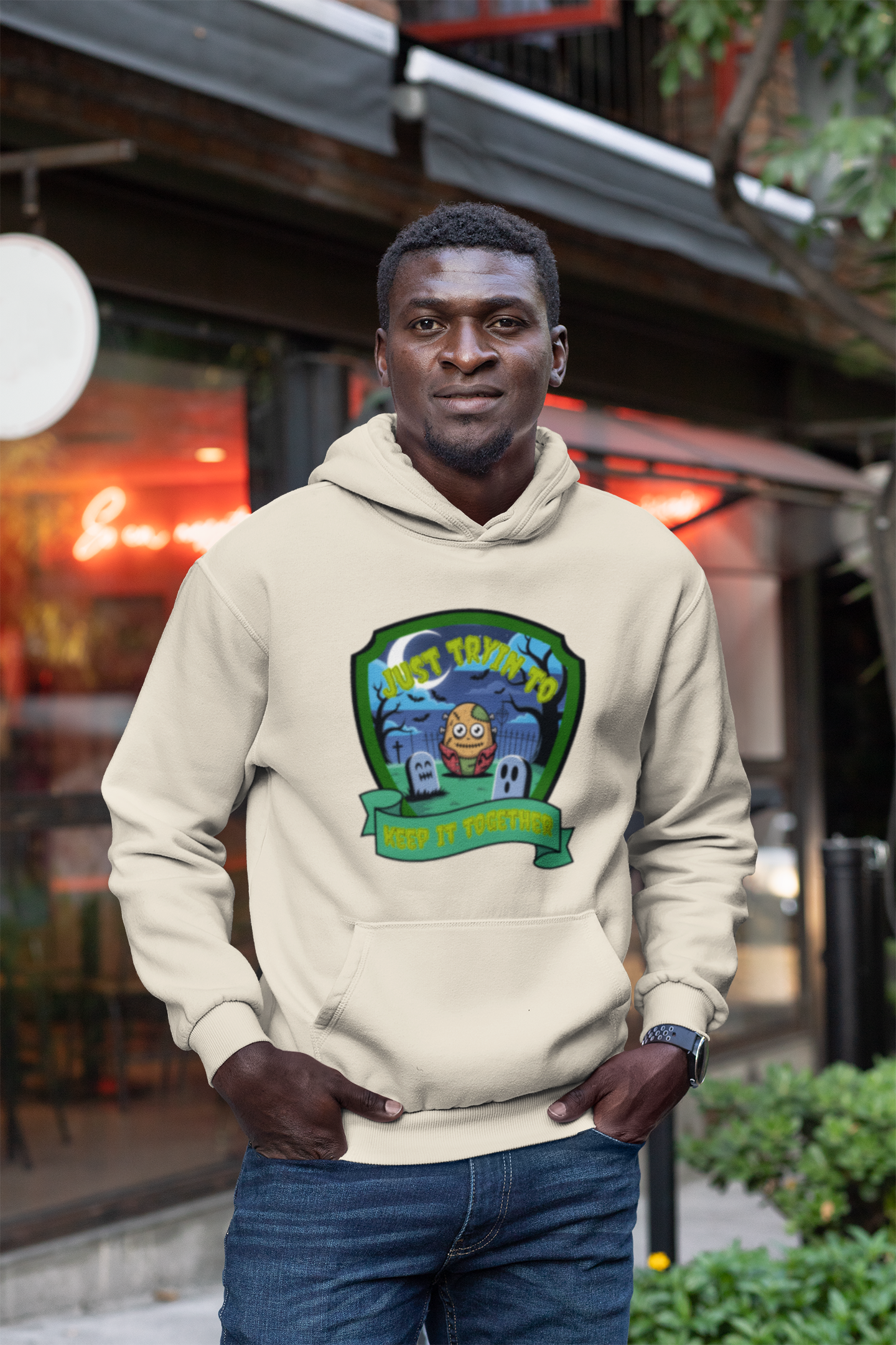 The Just Tryin’ To Keep It Together Hoodie wraps you in cozy softness—no matter what life throws your way. Crafted from Gildan Heavy Blend fleece with a splash of humor, this hoodie is the ultimate comfort food for your wardrobe. Perfect for busy days, messy hair, and snack breaks (lots of snack breaks).