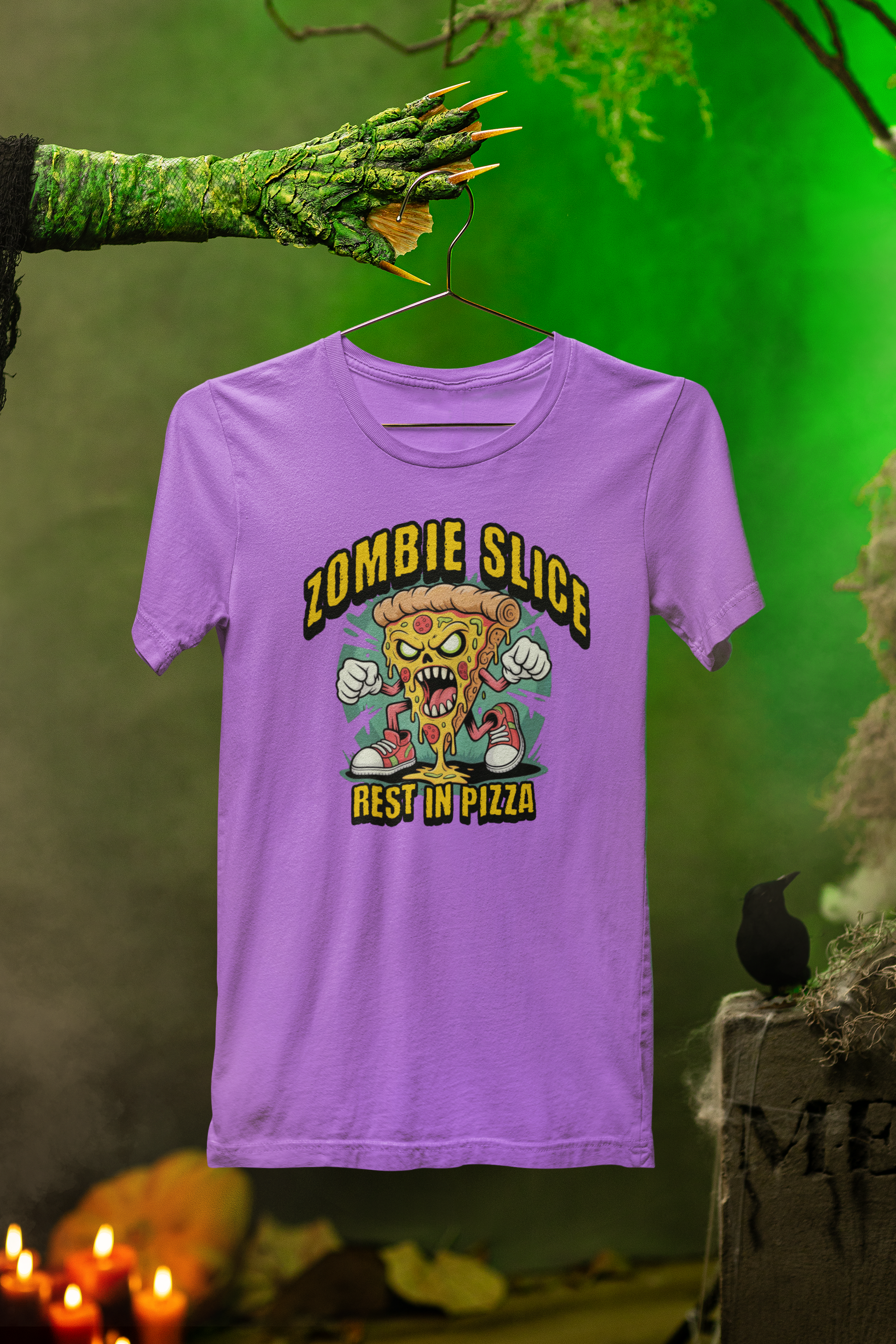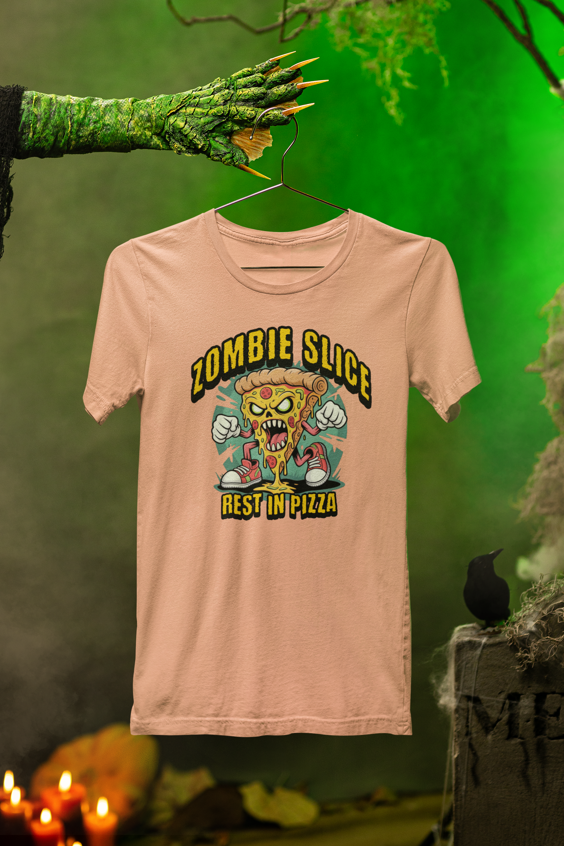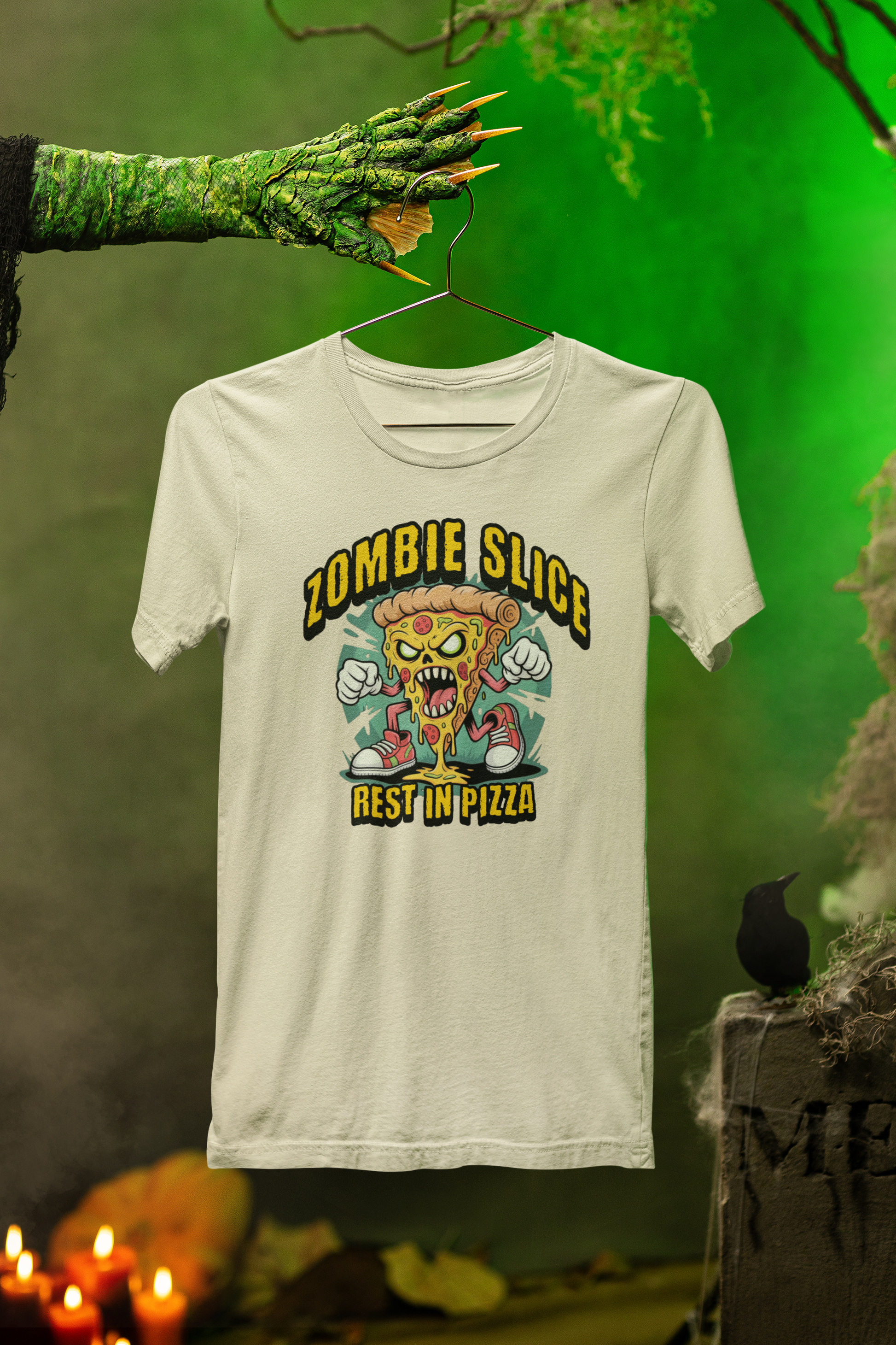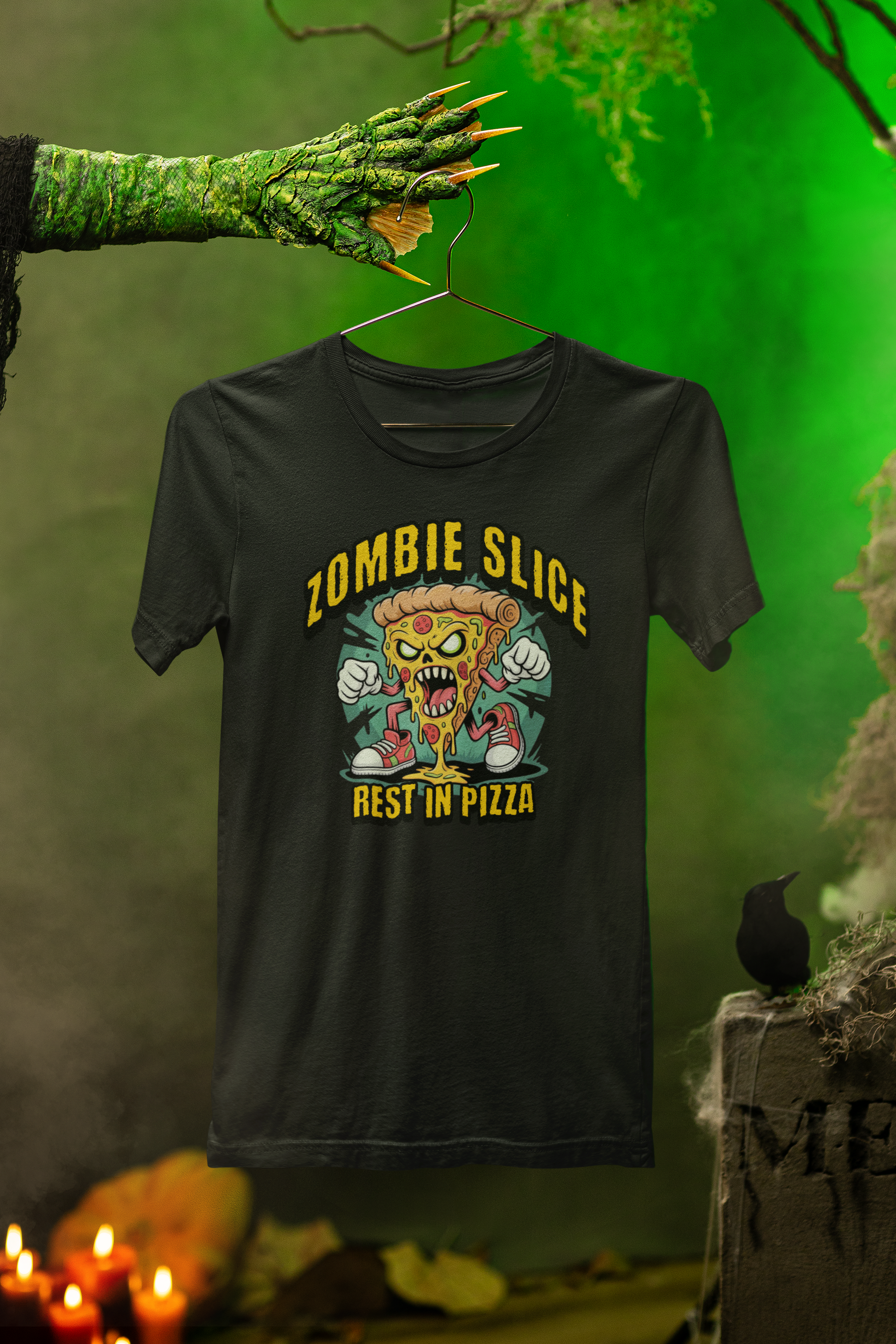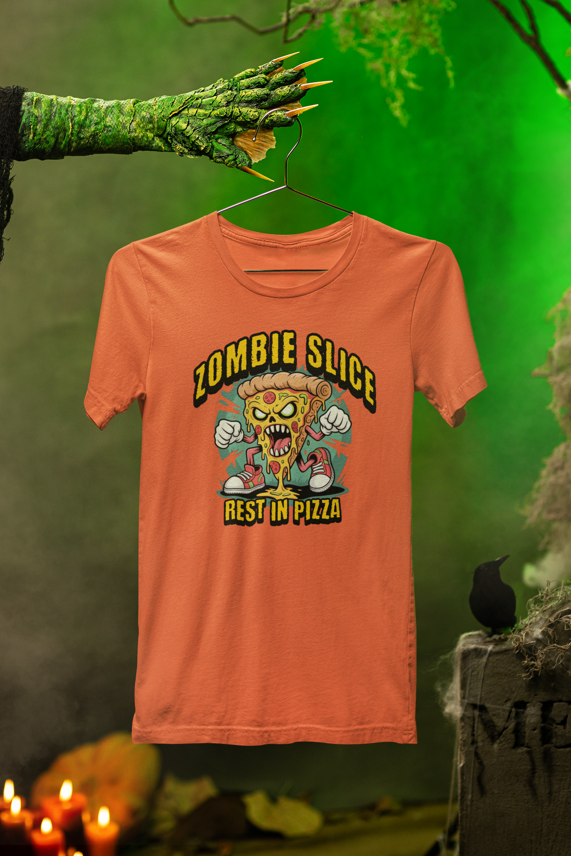 Sink your teeth into spooky season with the Rest In Pizza Tee! Featuring a hilarious zombie pizza slice—complete with oozing cheese, cartoon eyes, and just the right amount of fright—this shirt is perfect for trick-or-treating, haunted hangouts, or anyone who loves a food pun with their scares.
